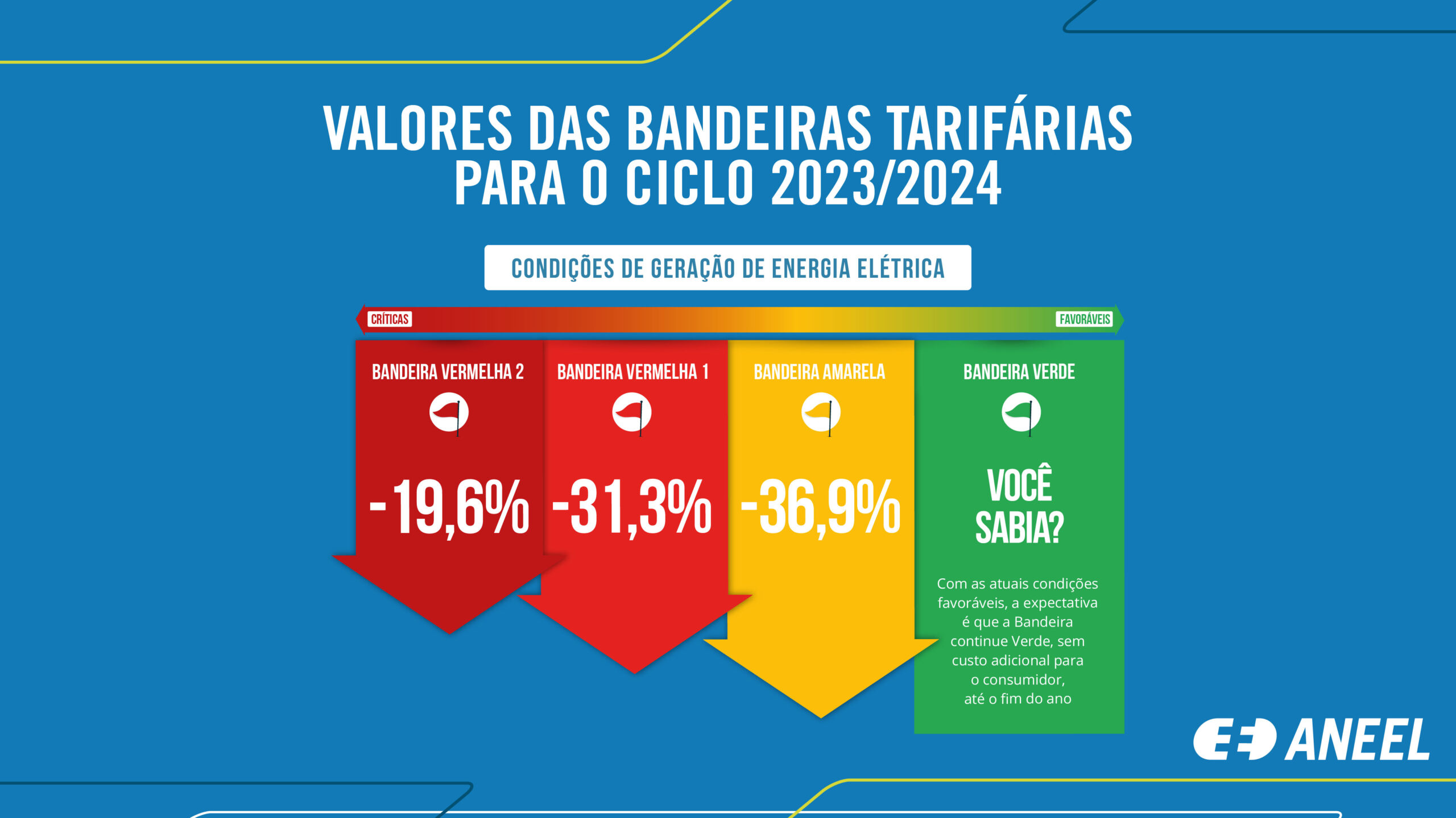 A ANEEL (Agência Nacional de Energia Elétrica) aprovou, nesta terça-feira (05), a redução dos valores de referência das bandeiras tarifárias para o ciclo 2023/2024.